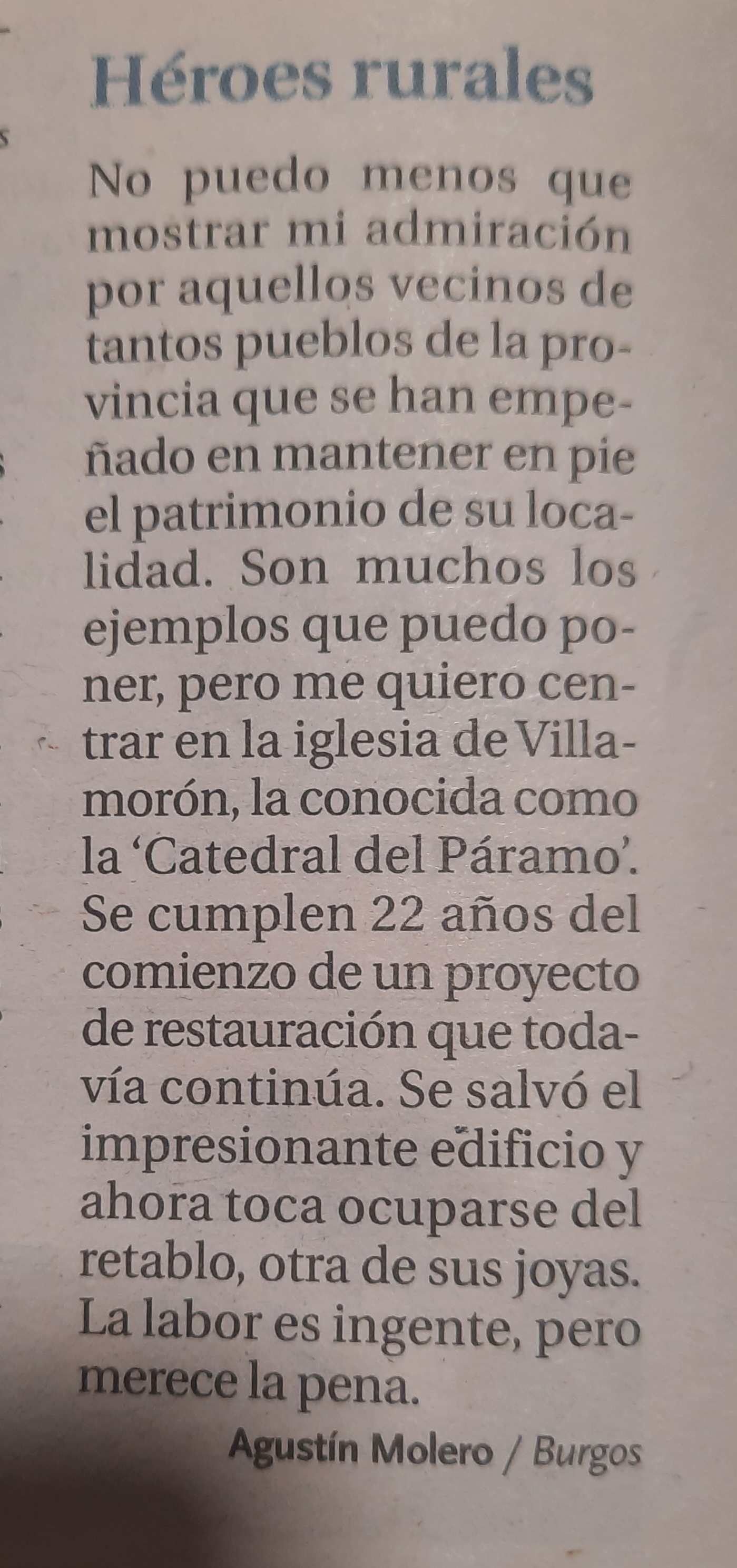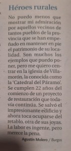 Adjuntamos carta de un lector de Diario de Burgos sobre la labor de tantos pueblos de Burgos por conservar su patrimonio, poniendo de ejemplo lo que se hace en Villamorón.
