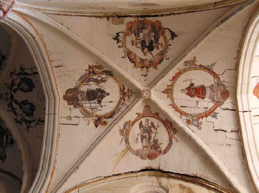 Las bóvedas son de crucería y los complejos soportes rematan en capiteles vegetales, de tallos entrecruzados, o de hojas rematadas en volutas, frutos, rollos o rosetas, con presencia ocasional de algún mascarón humano o de ménsulas con cabezas monstruosas.