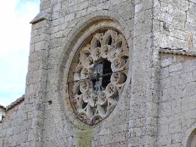 con filigrana de arcos apuntados y serie de pequeños círculos que repiten el mismo esquema de los óculos lobulados, y que nada tiene que ver con los pequeños rosetones que portan algunas iglesias románicas, más próximos al modelo de los laterales.