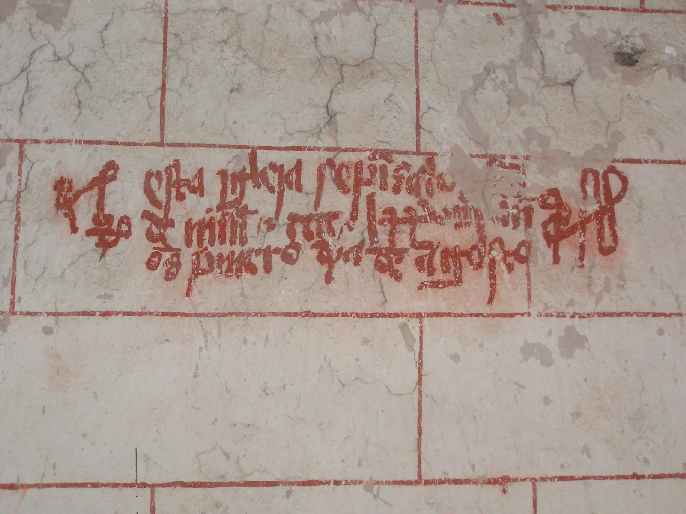 Todas estas pinturas creemos que son barrocas, aunque bajo ellas llegan a apreciarse otras, formadas por un simple despiece de sillares, con líneas rojas sobre fondo blanco. Curiosamente estas pinturas más antiguas están perfectamente fechadas por una inscripción, trazada a pincel, que se encuentra sobre el muro que ciega la puerta norte. Está escrita en letra gótica minúscula, en tres renglones y dice: